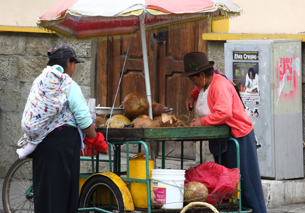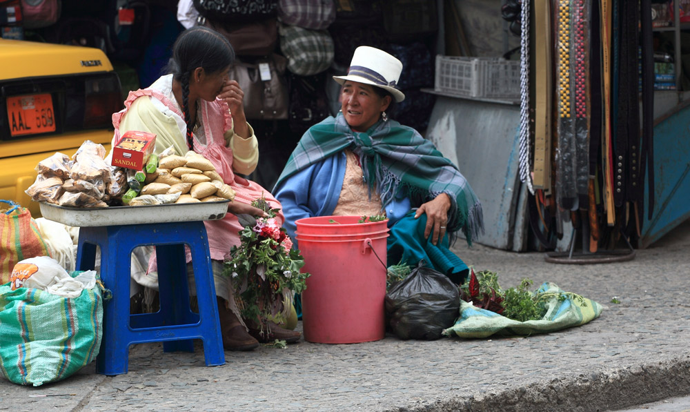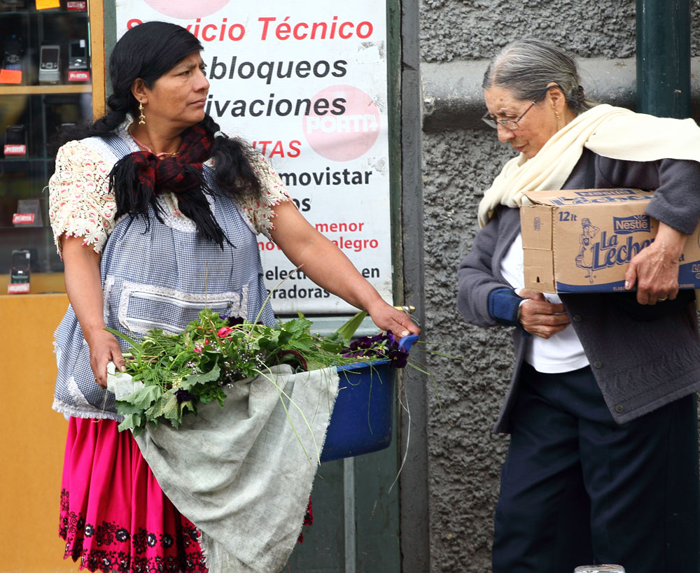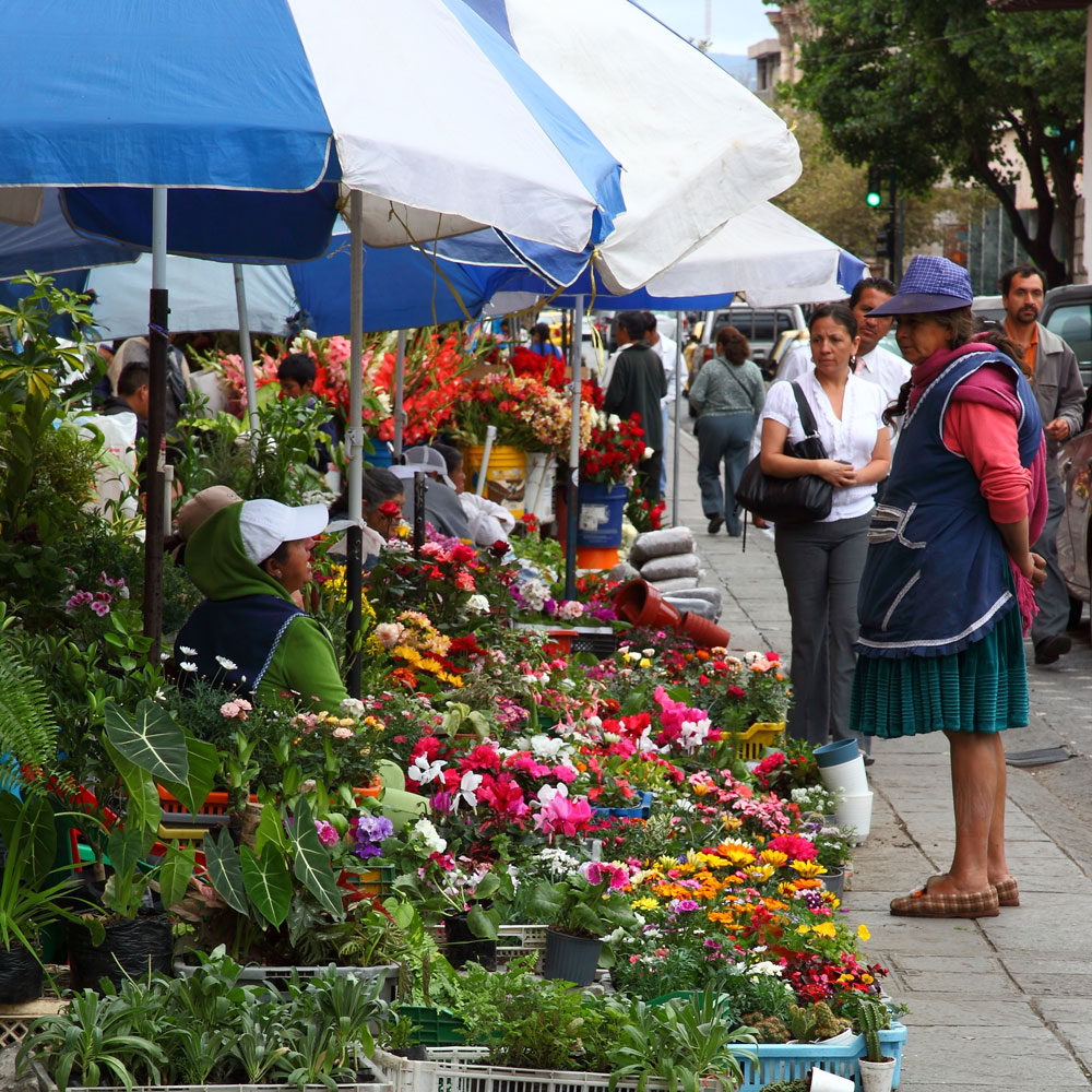 En arrière de la nouvelle cathédrale se tient un marché aux fleurs lumineux, coloré, odoriférant. Derrière leurs étals, affairées, assises sur de petits tabourets, les Cholas cuencanas en costume traditionnel vendent une variété infinie de fleurs parfumées.