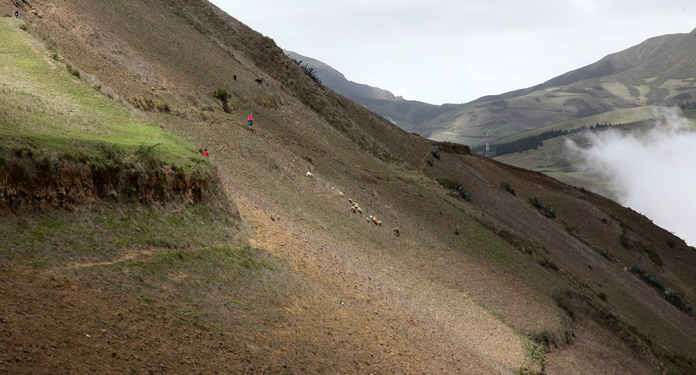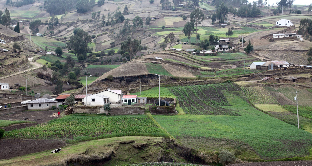 Tout au long du trajet, la route en bon état, serpente au milieu des montagnes et dans les nuages. Le paysage est bucolique et verdoyant, alternant culture et élevage qui prédominent dans cette région. Lamas, vaches et moutons paissent sur des terres grasses entre eucaliptus et résineux. La température à cette altitude moyenne de 3000 mètres est fraîche et le vent et la pluie ne sont pas en reste