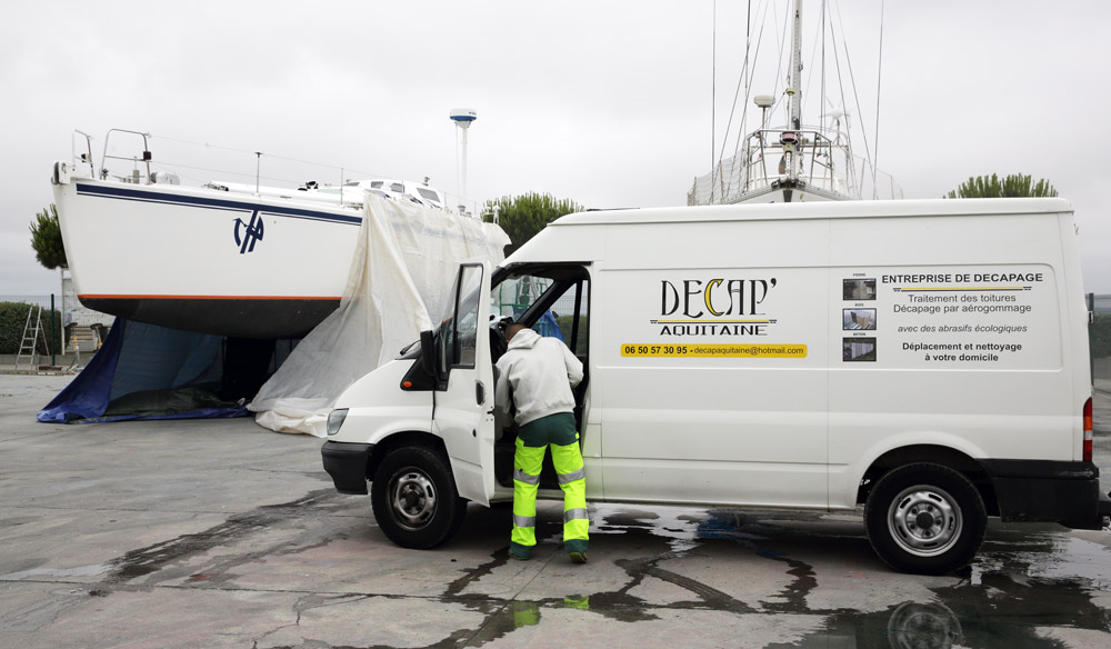 16 juin : Accumulation des couches de peinture antifouling au cours de ces dernières années. Nous avons opté pour une séance d'aérogommage pour les éliminer. Une bonne journée de travail entre la mise en place des bâches et l'aérogommage lui-même et à la sortie une coque toute propre avec quelques résidus éliminés par un simple ponçage à la main. La couche de protection époxy ayant elle aussi été légèrement abrasée nous repassons une couche de peinture époxy avant de remettre de l'antifouling, marque Jotun Sea Quantum) garantie 5 ans, acheté en Hollande pour un prix 5 fois inférieur au prix français (allez comprendre pourquoi).