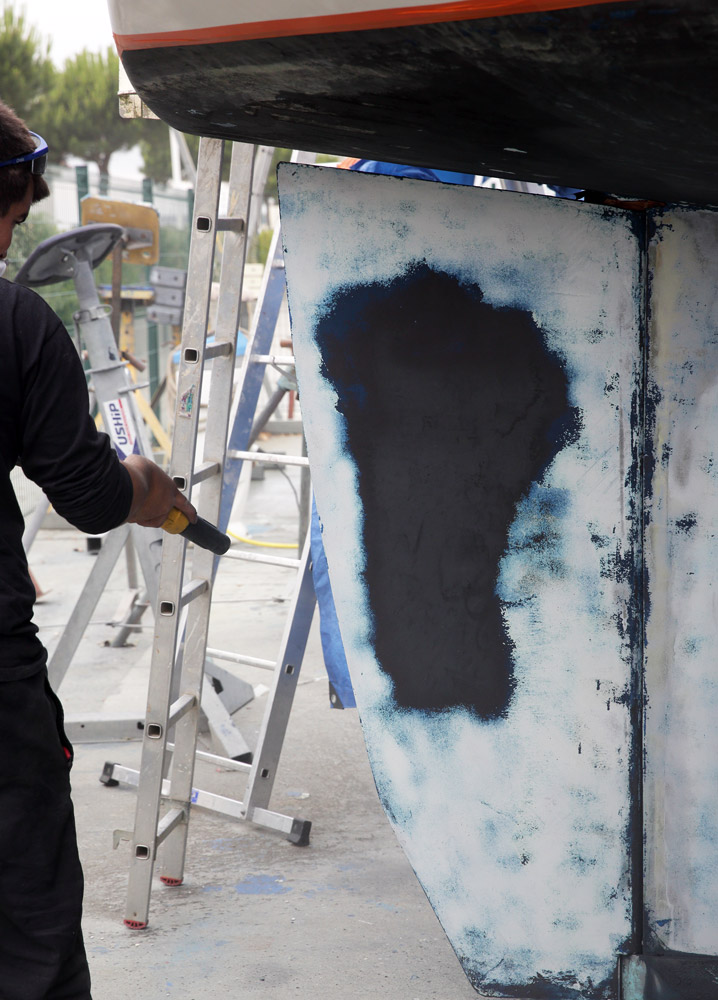 1 juillet : nouvel antifouling, reprise des extrémités des ailettes qui ont souffert dans le canal de Crinan à la fin de l'été dernier. Enfin reprise de l'aileron de protection du sail drive pour améliorer ses performances et limiter la traînée.