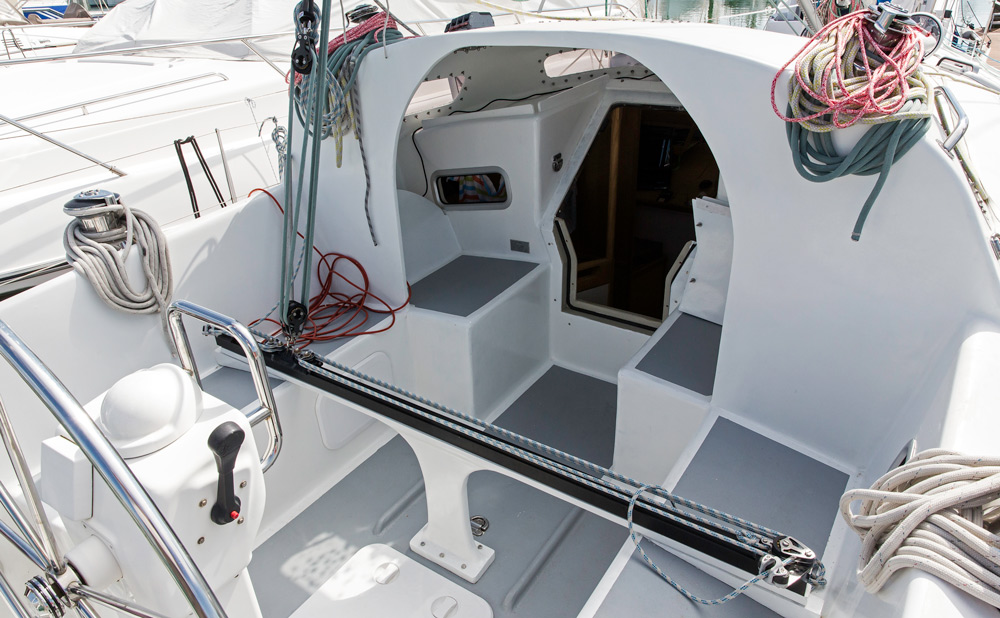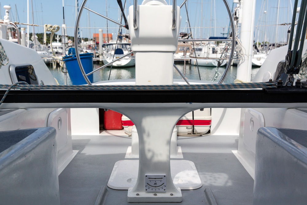 -Installation de l'accastillage de pont avec modification des passages des manoeuvres (trinquette, grand-voile, hale-bas) liés à l'abri. Le plus gros morceau fut la fabrication d'un support de barre d'écoute pour la grand-voile, le bridge-deck avec la nouvelle descente a été supprimé et donc le support de barre d'écoute aussi.