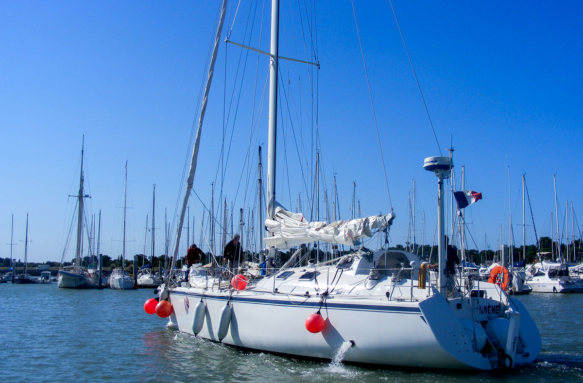 -Réglage du haubannage et mise en place des voiles (nouvelle grand-voile et nouvelle trinquette) avec comme surprise un enrouleur complètement bloqué. Jérôme Dupin, le voilier de Star Voiles qui venait livrer des voiles sur Port Médoc, a passé deux heures sur Noème pour essayer de résoudre ce bloquage. Finalement il s'est avéré que la pièce en matière plastique, guide de la bosse d'enrouleur, avait pris du volume au cours du temps et elle bloquait la poulie crantée. Après une cure d'amaigrissement à la meuleuse la poulie crantée retrouvait sa fluidité.