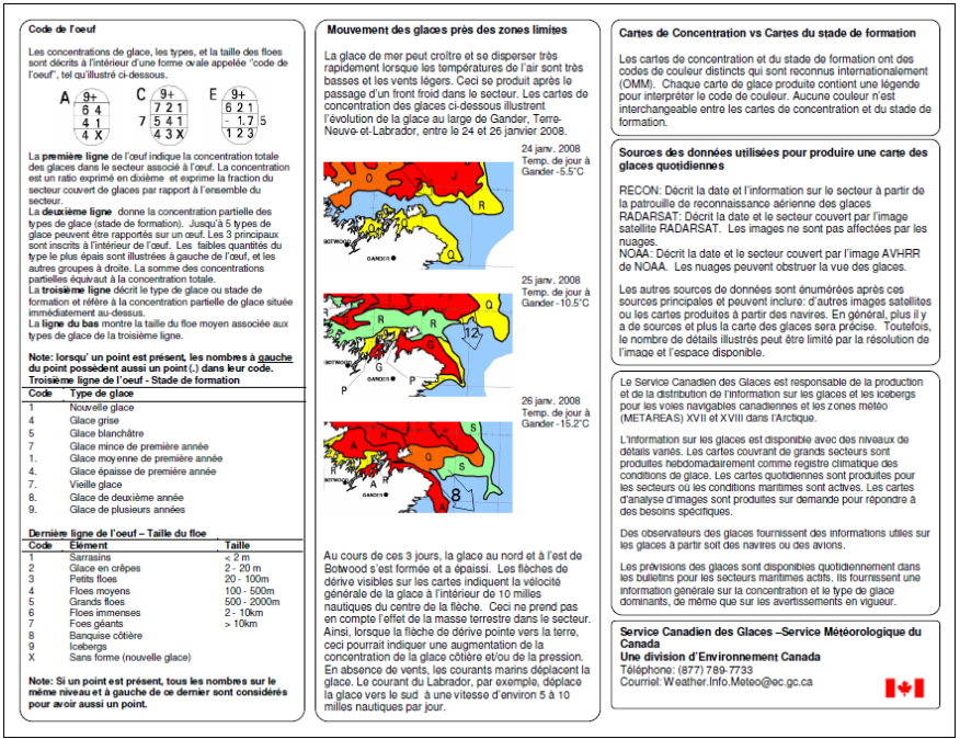 Le service météorologique, pour sa part, émet régulièrement des cartes des glaces qu'il est bon de savoir "traduire" pour les navigations dans l'Arctique canadien. Ces cartes sont obtenues sur le site Environnement Canada http://www.ec.gc.ca/glaces-ice/default.asp?lang=Fr&n=D32C361E-1 La réception de ces cartes nécessitent une connection internet à bord, ce qui est difficile d'obtenir en dehors des quelques liaisons possibles dans les hameaux ou petites villes reculées et éparpillées le long de la côte du Groenland ou du passage du Nord-Ouest lui-même.
