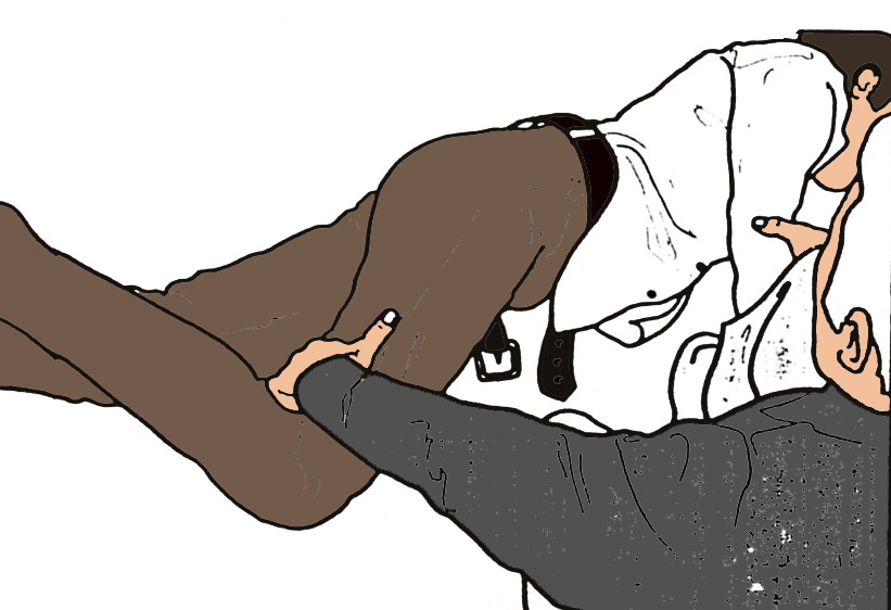 - Saisir le membre inférieur qui se retrouve dessus, le fléchir et amener le genou au contact du sol, ce qui à pour effet de bloquer le sujet et d’empêcher qu’il ne se retourne.
