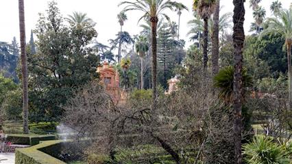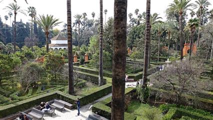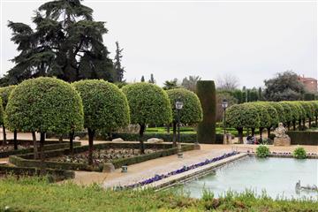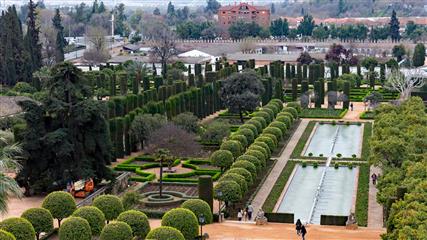 Les jardins de l'Alcazar s'étendent sur trois terrasses : à la terrasse supérieure, deux grands réservoirs recueillent l'eau accourue de la sierra et la canalisent vers la terrasse inférieure, à laquelle on accède par de grands escaliers. Sur cette terrasse, se succèdent trois grands bassins disposés en un axe unique au milieu de plantations multicolores, de fleurs chamarées et de haies de cyprès ; sur l'un des côtés, le plus près de l'ancienne muraille, des parterres orthogonaux de buis entourent des plantations de rosiers. Ces jardins possèdent plusieurs statues, dont celles d'Isabelle et Ferdinand les Rois Catholiques, rivalisant en sobriété avec les silhouettes des cyprès taillés. La seconde terrasse, située à l'extrémité méridionale près des deux grands réservoirs de la terrasse supérieure, est un jardin à croisillons avec des haies de buis, des plantations d'agrumes et une fontaine en son centre.