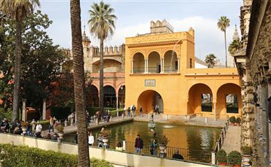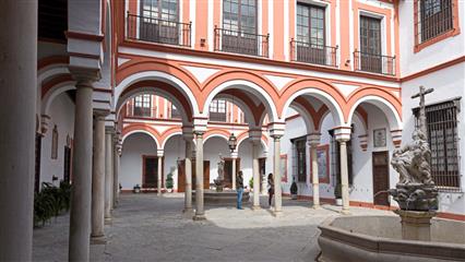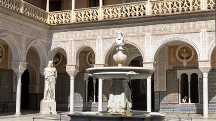 La Casa de Pilatos, construit à la fin du XVème siècle, est l'exemple le plus remarquable de l'architecture des palais sévillans. Le style mudéjar domine dans l'ensemble du bâtiment, associé à un style Renaissance et gothique flamboyant Achevé au début du XVIème siècle par don Fabrique de Ribera premier marquis de Tarifa. Un très beau patio avec ses arcs aux stucs finement ciselés, aux murs décorés de magnifiques panneaux azulejos du XVIème siècle aux motifs différents. Plusieurs statues d'origine romaine décorent le patio, il y a aussi une splendide statue grecque du Vème siècle av J.C.