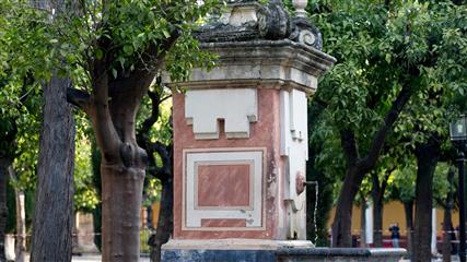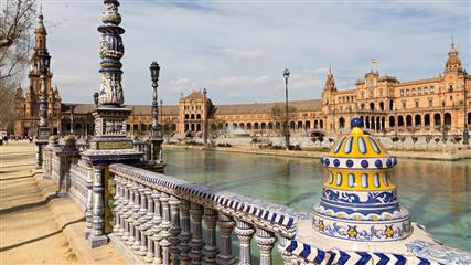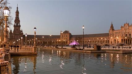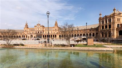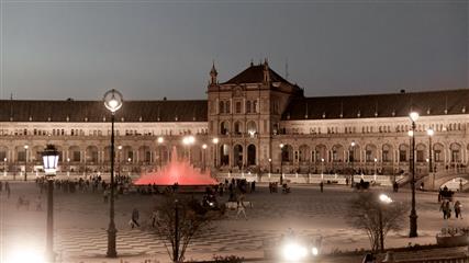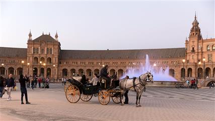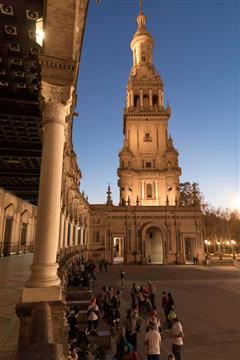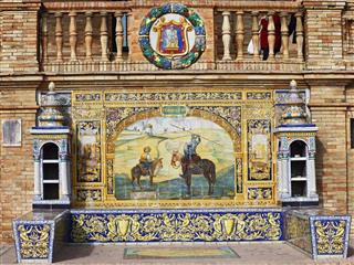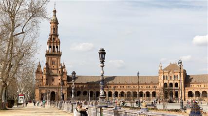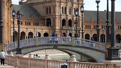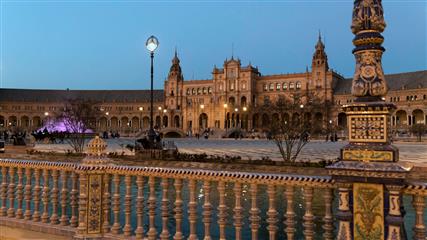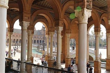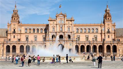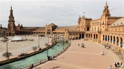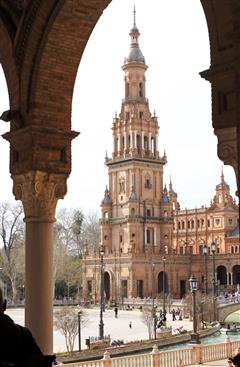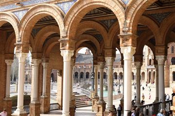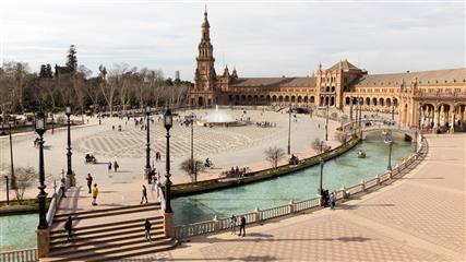 La Place d'Espagne est une immense place en arc de cercle de 200 m de diamètre conçue par l'architecte Anibal Gonzalez (1876-1929). Le bâtiment est parcouru par une longue galerie à arcades en briques ocres, encadré à chaque extrémité par deux tours de 80 mètres de haut. De petits ponts enjambent un canal sur lequel des petites barques avancent, propulsées par des coups d'avirons vigoureux. Une visite de nuit est à programmer, l'aspect de l'ensemble se révèle enchanteur. A la base de cet ensemble 58 bancs, disposés à l'intérieur de niches décorées d'azulejos qui racontent un évènement historique survenu dans chaque région d'Espagne, invitent le passant à s'assoir et profiter du spectacle