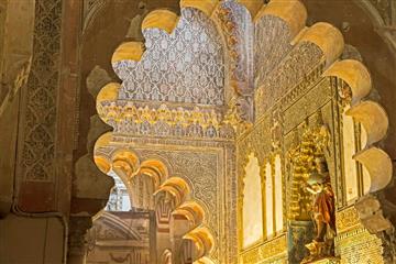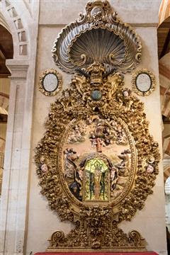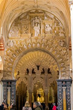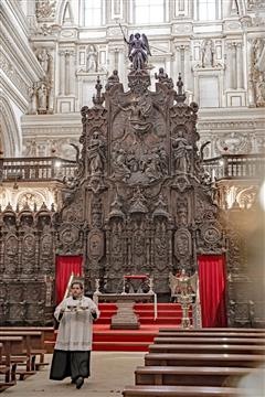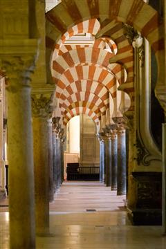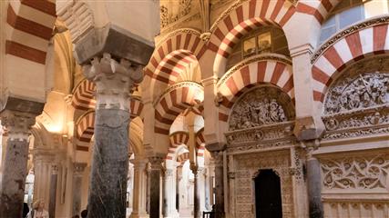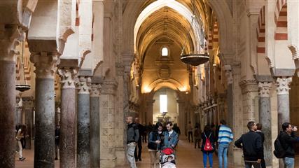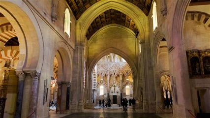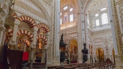 A l'intérieur une véritable forêt de colonnes et d'arcs en fer à cheval formés de claveaux alternant deux couleurs : le blanc pour les parties en pierre et le rouge pour les parties en briques, supportés par des colonnes de tonalité gris et rose. La lumière qui pénètre crée une atmosphère irréelle par un extraordinaire jeu d'ombres et de lumières. Un étonnant silence règne dans cette somptueuse bâtisse malgré le nombre impressionnant de visiteurs qui déambulent sous les travées. La décoration est une association de style mauresque et chrétien qui se déploie tout au long des murs et des plafonds. La cathédrale élevée au centre de la mosquée au XVIème siècle mêle arcs et voûtes hispano-flamande, coupoles Renaissance, maître-autel baroque. Le choeur est impressionnant, les stalles en acajou sculptées sont de toute beauté.