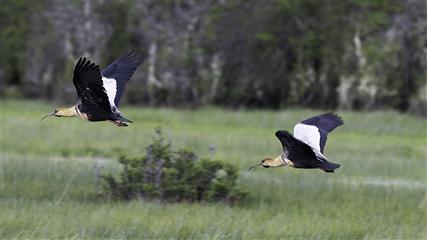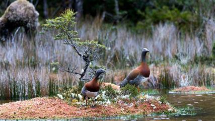 Au bord de la route à quelques mètres, sur un petit monticule moussu au milieu d'une petite étendue d'eau, un couple de Canquen (ouette à tête grise), oiseaux superbes, tout aussi surpris de notre présence, se laisse photographier sans trop d'appréhension avant finalement de s'éloigner. Encore quelques kilomètres et le panneau de la ville nous indique que nous sommes arrivés à bon port, escale ultime sur cette route.
