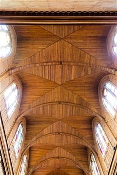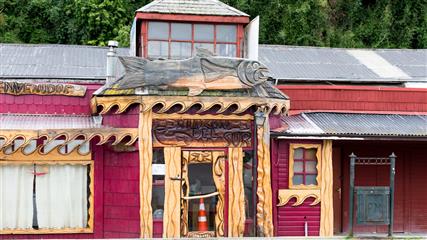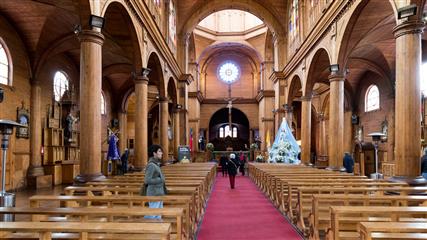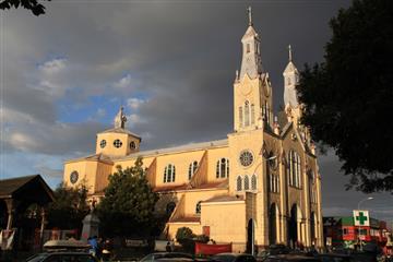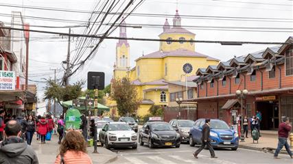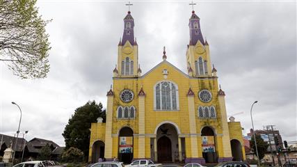Castro installée sur un fort promontoire est la "capitale" de Chiloé, une ville de 29 000 habitants très animée à l'architecture variée. C'est un plaisir de déambuler dans ses rues, de descendre au port, flaner sur la place centrale, discuter avec les marchands des rues, voir le marché artisanal, aller traîner vers les palafitos ces maisons sur pilotis construites au bord des estuaires où à marée haute viennent s'amarrer les navires, visiter les chantiers de construction navale. Surtout n'oubliez pas la cathédrale San Francisco construite en 1906 à l'emplacement d'une précédente église partie en fumée. Entièrement construite en bois malgré tout après bien des hésitations au regard du destin des deux précédentes églises construites elles aussi en bois. L'intérieur totalement lambrissé est d'un dépouillement éblouissant, la peinture extérieure jaune et violette est pour sa pat originale et surprenante.