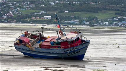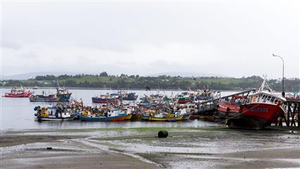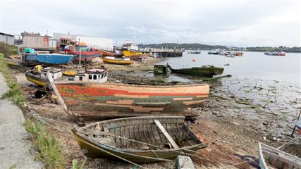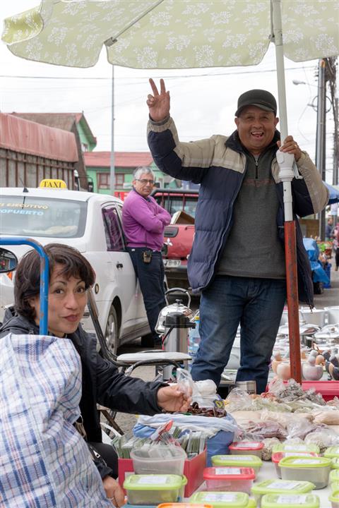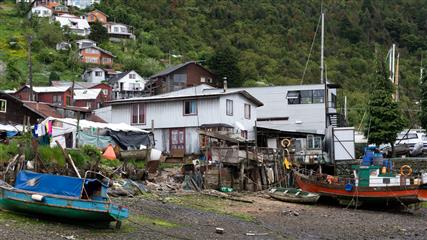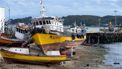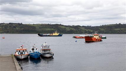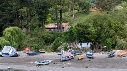 En fin d'après-midi nous filons au sud vers Quellon à la pointe la plus septentrionale de la Panaméricaine car le ferry part à 3 heures du matin en direction de Chaitén sur le continent. Hors de question de rater le départ. Quellon est un des ports principaux de l'île, elle dispose d'une industrie de conservation des produits de la mer très dynamique. La ville n'a pas beaucoup d'intérêt mais le port et ses nombreux bateaux de pêche offre un univers très coloré. Le Museo Inchi Cuivi Ant propose une belle exposition sur la culture huilliche et aussi sur les vestiges d'un moulin et d'une habitation typique chilote. A la nuit tombée c'est l'attente du départ du ferry dans une salle peu confortable sur des sièges avachis de la compagnie Naviera Austral, salle d'attente encombrée de nombreux paquets et bagages, au milieu d'un va-et-vient incessant de chauffeurs de camions, de touristes accompagnés de leurs vélos ou tout simplement à pied, et bien sûr de tous les chilotes qui se rendent à Chaitén pour commercer ou rejoindre leur famille.