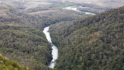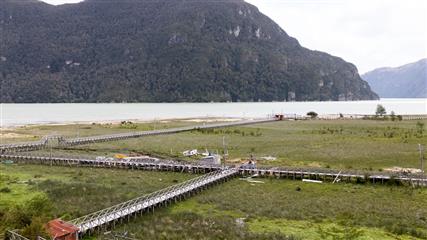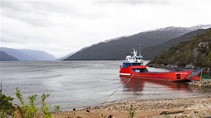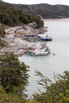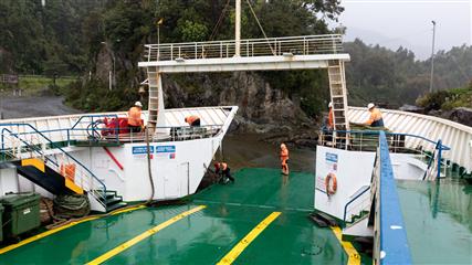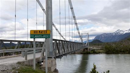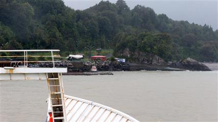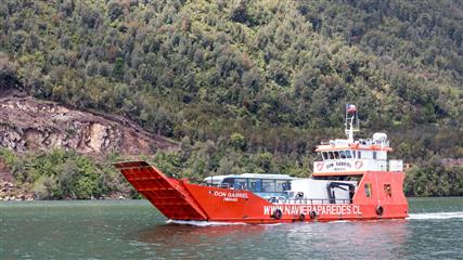 A Puerto Yungay, petit port situé dans le fjord Michel, la route s'interrompt. Seul un traversier peut nous acheminer plus loin. La montagne et les forêts sont infranchissables, ici pas de route mais un petit ferry de faible tonnage capable d'embarquer quelques voitures et passagers et ainsi assurer la continuité avec la Carretera Austral. Trajet gratuit. Tous les passagers et véhicules débarquent à Rio Bravo une quarantaine de minutes plus tard. Bien que la circulation soit modeste il n'est pas rare de ne pouvoir embarquer immédiatement et de devoir attendre la rotation suivante. Plus qu'une centaine de kilomètres à rouler sur une route caillouteuse mais assez bien entretenue.