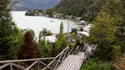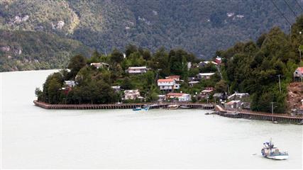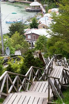18 novembre : Une courte étape aujourd'hui. Nous quittons notre chalet accompagnés d'une pointe de bruine sur une route toujours aussi précaire pour arriver en début d'après-midi à Caleta Tortel un village de 500 habitants peuplé essentiellement de bûcherons et de pêcheurs. Le village, accroché à une montagne aux flancs recouverts d'une exubérante forêt, les pieds dans l'eau du Golfe de Pena, se parcourt uniquement à pied après avoir garé la voiture sur une minuscule place où les autocars viennent faire demi-tour et embarquer des passagers pour des destinations mystérieuses. En effet c'est un village sans rues. Un réseau unique de passerelles et d'escaliers, sans fin, en bois, parcourt le village de bout en bout, relie les maisons entres-elles, parfois supendues au-dessus du vide, parfois au-dessus de l'eau. Tortel fait référence à Jean Tortel, un marin français, qui a joué un rôle important au cours de la guerre d'indépendance du Chili.