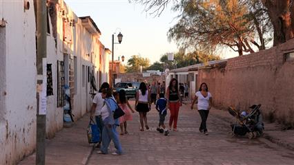 Perché à 2440 m de hauteur, au centre d'un des rares oasis du désert d'Atacama, San Pedro petit village aux maisons en adobe, aux ruelles en terre, sa place ombragée et son église, est toujours aussi pitorresque mais, car il y un mais, le développement incessant du tourisme est en train de tuer ce magnifique endroit. En dix ans les maisons du centre ont été transformées en restaurants, bars, boutiques à souvenirs, hôtels. Et que dire du nombre d'agences de voyages qui a littéralement explosé et qui proposent toutes les mêmes destinations. Le premier soir, la foule est si importante si compacte, qu'il paraît difficile de croire que l'on est dans un petite village censé être perdu au milieu du désert le plus aride du monde.
