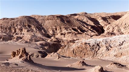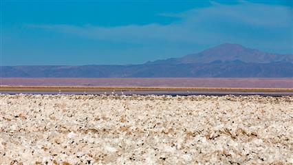 - le Salar de Atacama le salar le plus étendu du Chili : une saline de 320 000 ha à cent km au Sud de San Pedro, c'est aussi, hélas, un des plus grand gisement de lithium de la planète. Ce paysage s'admire plus facilement à la Laguna Chaxa qui en fait partie.