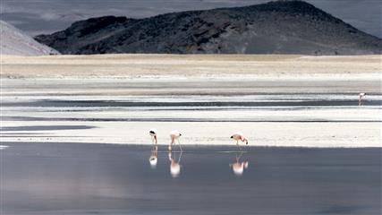 -La Laguna Tebenquiche : lagune recouverte en grande partie d'une épaisse croûte de sel qui est un véritable miroir dans laquelle se reflète le ciel et les nuages en mouvement, encombrée de flamants qui s'agglutinent et se mirent en masse sur la surface.