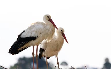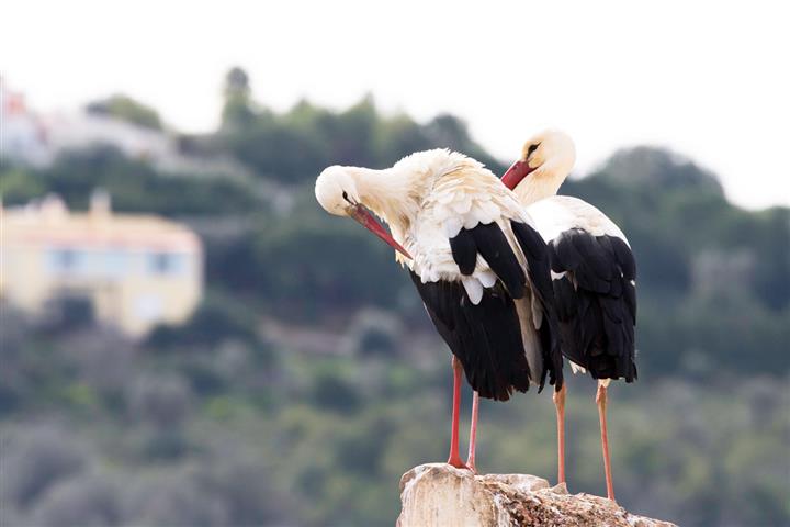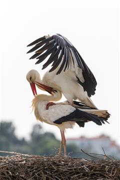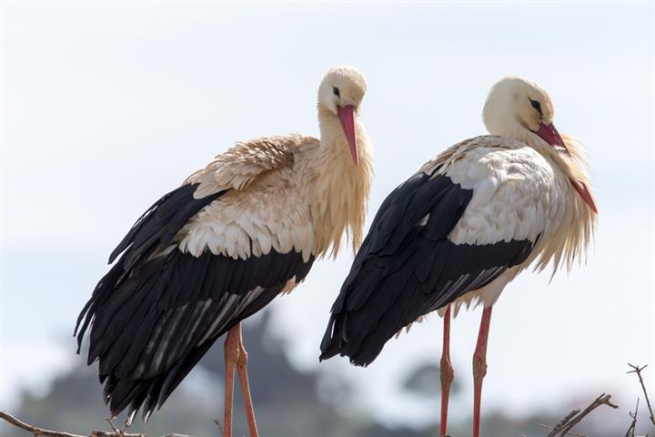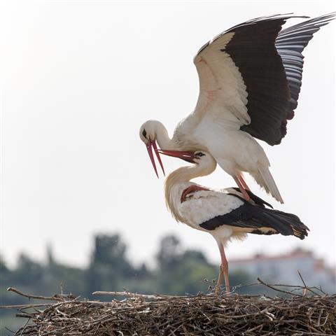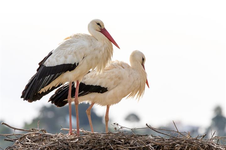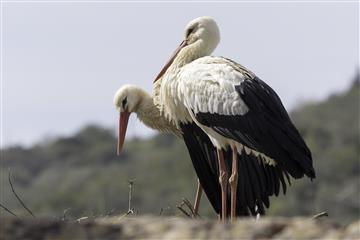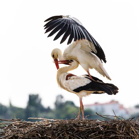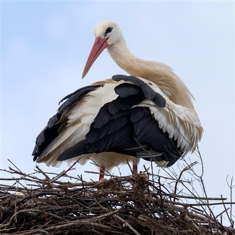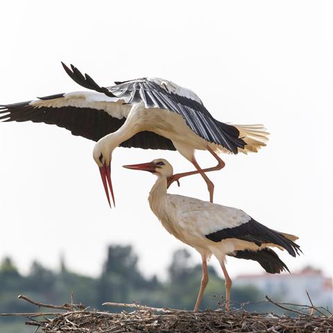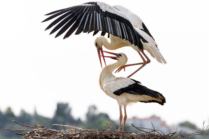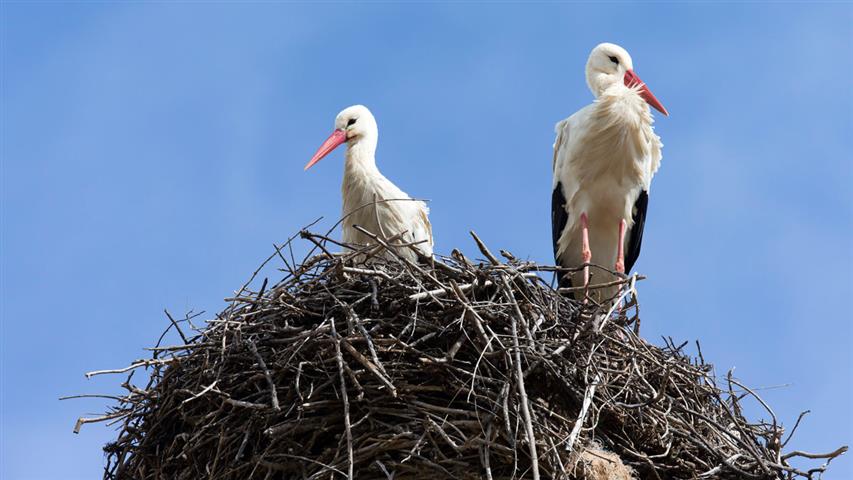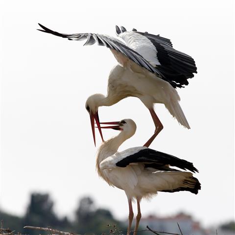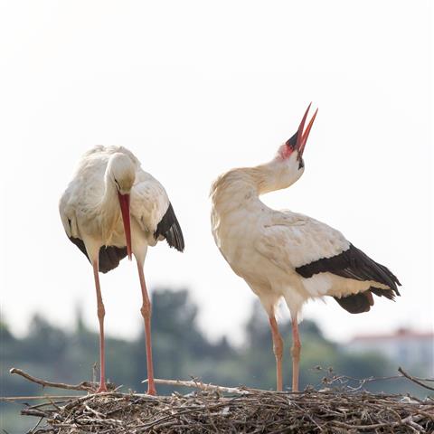 La parade nuptiale combine des postures étonnantes associées à des claquements de becs.