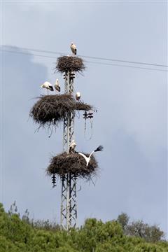 Depuis quelques années et en raison du réchauffement climatique elles séjournent de plus en plus dans le sud du Portugal et de l'Espagne où certaines populations sont résidentes à l'année si la nourriture est suffisante. La cigogne blanche habite des zones ouvertes et dégagées de cultures et pâturages, les prairies humides et les plaines bordant le cours des rivières, les vergers et champs irrigués. Les nids sont bâtis aussi bien sur des pylônes que des cheminées ou des arbres, tout support en hauteur est acceptable si il est haut et à découvert. Le nid est utilisé pendant plusieurs années par le même couple. Elles se nourrissent en groupes et nichent les unes près des autres. La cigogne peut rester posée sur une seule patte longtemps en lissant son pumage de son bec.