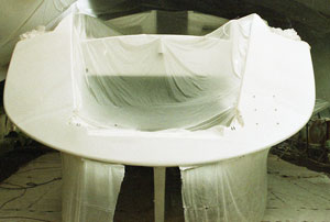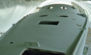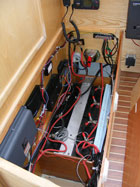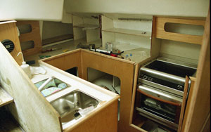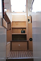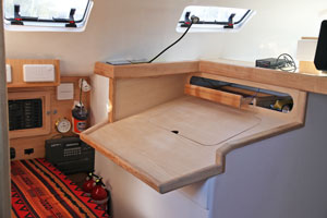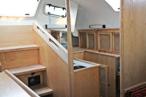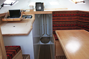 La coque et le pont élaborés chacun sur une forme mâle présentent côté intérieur un aspect lisse qui limitera l'application d'un enduit. Le voilier étant insubmersible la majorité des cloisons sont en sandwich. Façonnées sur un moule plan elles présentent une face totalement lisse, Nous n'aurons à enduire qu'une face et aussi la stratification des liaisons pont-cloisons et coque-cloisons. Passer l'enduit est une chose mais poncer un enduit époxy dans un espace restreint n'est ni simple ni commode. Nous appliquerons ensuite une peinture époxy dans les fonds et une peinture polyuréthane bi-composant sur le reste de la coque. Les aménagements,simples et fonctionnels, en contre-plaqué marine finition frêne associé à des massifs frêne eux aussi, seront traités avec une lasure incolore pour faciliter l'entretien. Nous poserons les circuits d'eau et d'électricité au cours de l'installation de l'ameublement. L'électronique du bord attendra la fin des travaux pour être installée.