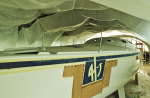 Après ponçage, application de trois couches de peinture époxy sur toute la coque suivie de trois couches de peinture polyuréthane bi-composant sur les œuvres mortes, de trois couches d’antifouling sur les œuvres vives et sur le pont passage de deux couches de peinture antidérapante Deck Lin (Sicomin). Le tout peint au pistolet. Pour avoir une finition bien brillante il faut être à la limite des coulures en permanence, pas facile.