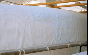 Pose d’un tissu micro-perforé qui permet le contrôle du flux de résine. Les bandes de ce tissu ne doivent pas se chevaucher