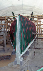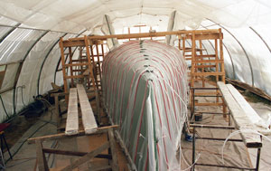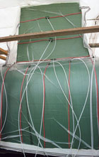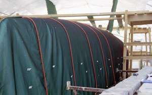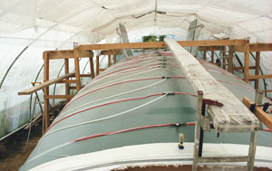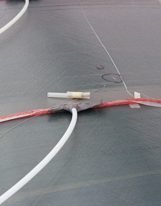La résine est distribuée sur la pièce par des rampes perméables. Nous avons pour notre part utilisé du tube spiralé mis en place dans une gaine d’emballage de couleur orange et l’ensemble cousu sur le filet vert. Ces rampes ont été disposées pour répondre à une injection de résine fractionnée. La distance entre chaque rampe est déterminée par un essai préalable sur un échantillon comprenant la totalité des tissus à imprégner. On doit mesurer la vitesse de diffusion de la résine, car plus on s’éloigne de la rampe nourricière et plus la vitesse de diffusion diminue et la résine finit par s’arrêter. La distance retenue est celle qui correspond au meilleur compromis vitesse/diffusion/distance. Dans notre cas la peau intérieure était plus épaisse dans les fonds que sur le bordé aussi a-t-il été installé une rampe intermédiaire plus courte correspondant aux renforts de fond de coque, cette rampe intermédiaire a pour but de rattraper le front de résine qui diffuse plus rapidement là où l’épaisseur des tissus est moindre.