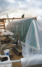 Pour la peau intérieure de notre coque l’infusion dura 8 heures avec infusion de 240 kg de résine pour 9 couches de tissu (bi-biais 600 g 5 couches, kevlar 4 couches soit un poids de verre de 420 kg) en sachant que la perte induite par les tissus techniques et tuyaux a été évaluée à 60kg.