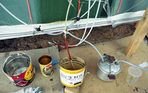 Dès que tout est en place le premier mélange est effectué. Nous avions préparé la résine par doses de 5 kg dans des pots métalliques et la quantité de durcisseur pour ces 5 kg dans un pot plastique. Il n'est pas question de mélanger la totalité de la résine en une seule fois, elle prendrait en masse. Les doses seront mélangées au fur et à mesure de l'avancée de la résine dans les tissus. On choisit d'alimenter comme première rampe celle du milieu, on alimentera les autres rampes en fonction de l'avancée du front de résine, la rampe suivante ne sera ouverte qu'après avoir été franchie par la résine de 7 à 8 centimètres.