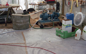 Une fois la bâche installée et le joint collé, mise en route de la pompe à vide. Il existe différent type de pompe à vide, nous avons une pompe à vide à anneau liquide triphasé; un appareil fiable est indispensable pour obtenir un vide correct, un compactage des tissus satisfaisant et la diffusion de la résine. Une panne de la machine et tout est à refaire.