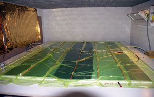 Le bateau étant insubmersible toutes les cloisons et une partie des aménagements sont en sandwich. Nous avons infusé des panneaux plats sur une table de stratification étanche. Une fois ces panneaux post-cuits les cloisons et les aménagements y ont été découpés