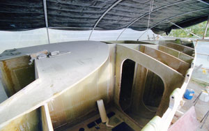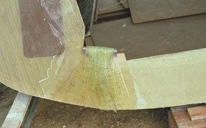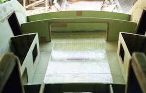 Les cloisons une fois découpées sont installées au fil à plomb et assurées par des cales. Un joint congé époxy est passé avant de stratifier des bandes de tissus de verre pour fixer définitivement les cloisons.