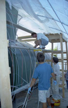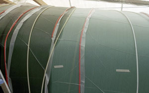 Après infusion de la peau extérieure, mise en route de la post-cuisson de l’ensemble de la coque à une température de 60° C pendant 18 heures pour que la résine puisse bénéficier de toutes ses caractéristiques techniques. Nous avons utilisé un puissant chauffage industriel.
