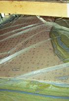 L'étape suivante consiste à coller la mousse du sandwich, là aussi sous vide. Pour un collage sans bulle il convient de trouer la mousse pour que l'air puisse s'échapper. A cette étape on disposera les différents inserts en contre-plaqué pour les différentes vannes,accasttillage, passe-coque, etc...