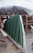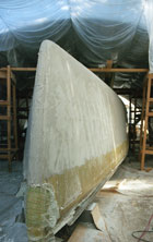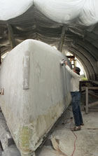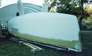 Puis enduire et poncer jusqu’à obtenir une coque lisse sans défaut. Le plus long et le plus pénible. Le ponçage représente de longues semaines de travail. Enfin peindre avec une peinture époxy avant de retourner la coque en laissant le livet libre pour la jonction pont-coque ultérieure.