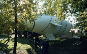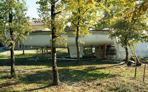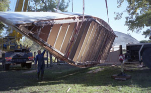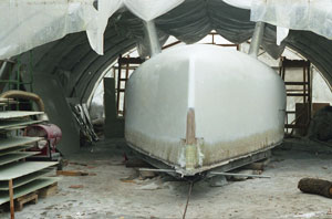La coque fut retournée à l’aide de deux grues, le moule restant en place (y compris les IPN) pour éviter d’utiliser un conformateur.