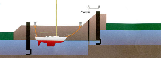 Laisser libre la zone comprise entre la porte de l'écluse (B) et la marque signalée sur le mur du quai (A). Devant cette zone les turbulences générées par l'ouverture des vannes sont violentes provoquant de gros bouillonnements à faire danser une gigue à votre bateau.