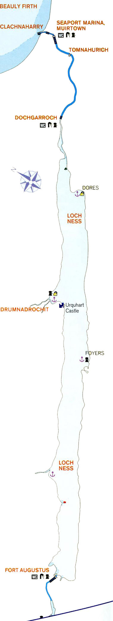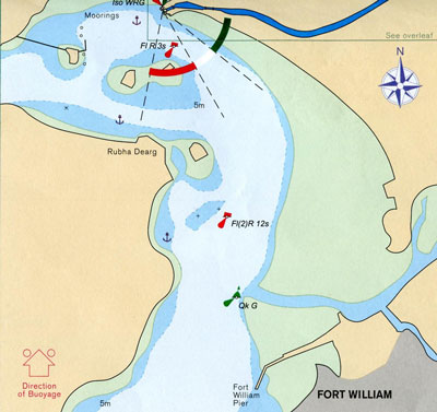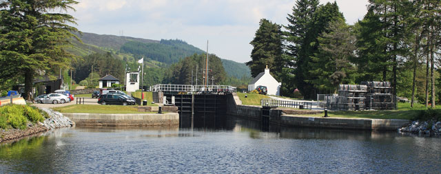 L'entrée se trouve à Corpach au fond du loch Linnhe un peu au nord de Fort William. Un éclusier vous reçoit et effectue les formalités. Il va ouvrir la première porte et vous entrez dans ce fameux canal. A quelques encablures, à Banavie, se dresse l'escalier de Neptune. Une heure et demie pour franchir neuf écluses consécutives. Impressionnant dénivelé. Juste après, le ponton de la marina de Banavie vous accueille. Un calme serein règne sur cette portion de canal, où installé sur le quai, vous pouvez admirer le Ben Nevis, la montagne la plus haute d'Ecosse (et de Grande Bretagne). Puis une succession de quatre lochs réunis par des bouts de canal et ses portes à franchir avant d'arriver à Inverness. Loch lochy, loch Oich, le fameux loch Ness et le loch Dochfour. Suivent deux ports où l'on peut rester quelque temps Caley marina et Seaport marina. Il est aussi possible de passer les dernières portes et se rendre à Inverness où un nouveau port de plaisance a ouvert fin 2008.