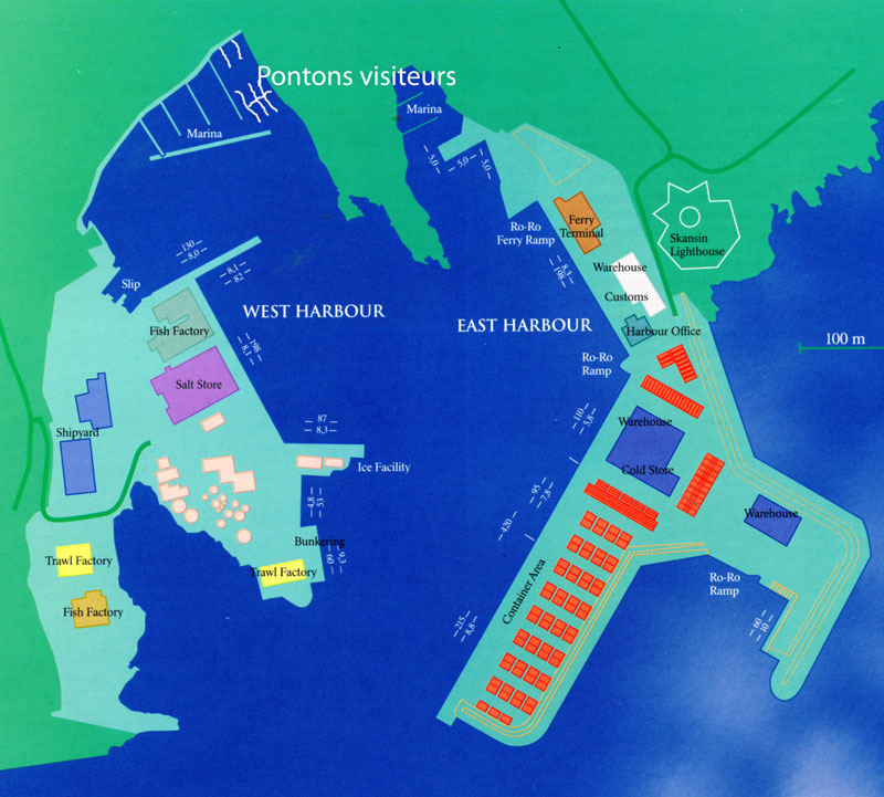 A l'arrivée à Torshavn appeler le port par VHF canal 12 ou se rendre au bureau du port. Ne pas oublier de contacter les douanes qui viendront à votre bord pour les formalités. Les Féroé font partie de l'espace Shengen mais pas de la CEE. Un nouveau ponton vient d'être installé le long du quai où auparavant les voiliers venaient s'amarrer. Il y a l'eau et l'électricité. Les tarifs sont de 80 DKr/jour pour les bateaux de plus de 10 mètres et de 50DKr/j pour les bateaux de moins de 10 mètres (électricité en plus). Douche au Club de voile sur le quai. La carte d'entrée des sanitaires (il y a aussi machine à laver le linge et sèche-linge) est à retirer à l'office de tourisme à 100 m sur la droite au bout du quai.
