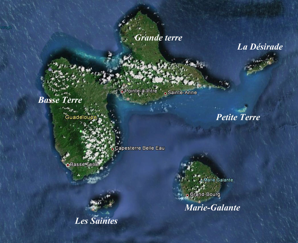 La Guadeloupe est un archipel situé au coeur de l'arc antillais. Les deux plus grandes îles Grande Terre et de Basse Terre sont séparées par un isthme marin très étroit dénommé la rivière salée. Le relief de Grande Terre est aussi plat que celui de Basse Terre est montagneux. La Désirade tout en longueur à l'est de Grande Terre. Marie-Galante toute ronde au sud-sud-est de Grande-Terre. Dans le prolongement de la pointe des châteaux à l'est de Grande Terre les îles de la Petite Terre, deux petites îles réserve naturelle, Terre de Haut et Terre de Bas. Enfin les Saintes à dix kilomètres au sud de Basse Terre archipel constitué là aussi d'une Terre-de-Haut et d'une Terre-de-Bas, auxquelles leur sont associés îlet Cabrit, Grant Ïlet et quelques autres petits îlets.