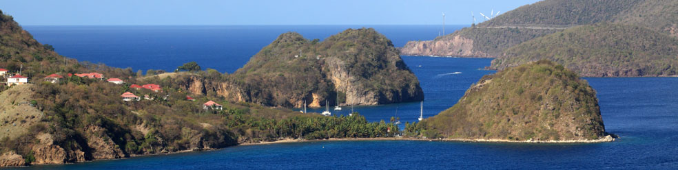 Les Saintes petit archipel au sud du grand. Terre-de-Haut et Terre-de-Bas sont les deux seules îles habitées. Un relief très accidenté les caractérise : Terre-de-Haut dominé par le morne du Chameau (309 m) avec une baie sublime et Terre-de -Bas très sauvage avec un seul accès à la mer.