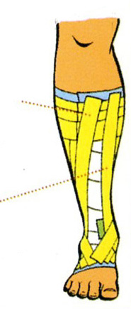 Répéter la même opération à la face externe du genou puis poser en haut et en bas un bande élastique de 6 cm de large pour vérouiller les attelles