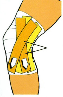 Pose de deux attelles longitudinales de 6 cm de large à la face interne du genou.