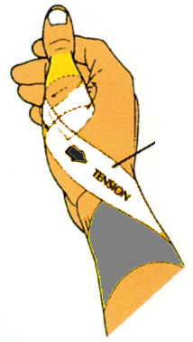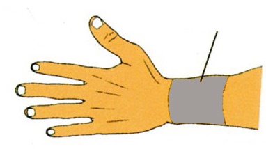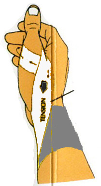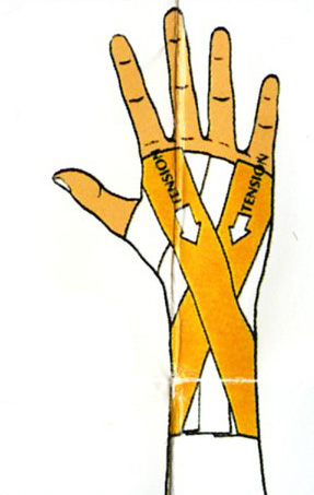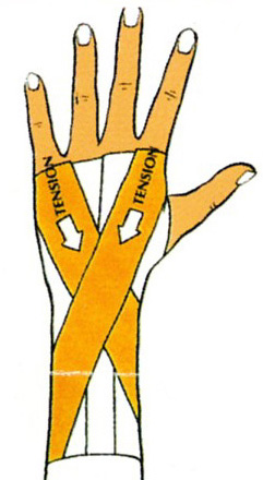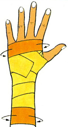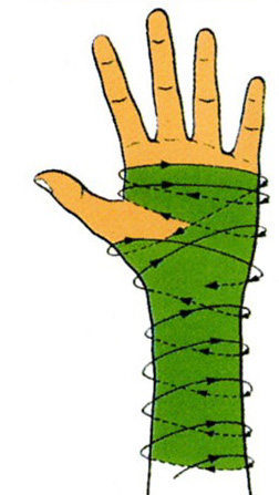 Mise en place d'une bande élastique de 6 cm de large à la base des doigts et au tiers de l'avant-bras. La poser sans tension.