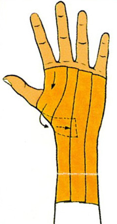 Pose de 4 attelles longitudinales celle qui passe sur la base du pouce sera repliée sur le dos de la main.