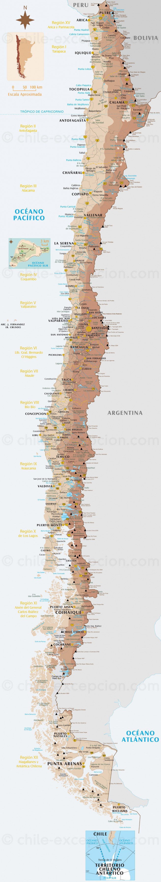 La colonne vertébrale du Chili est représentée par les Andes qui ont commencé à se former il y a 60 millions d'années. Les sommets des Andes chiliennes dépassent très souvent 6000 mètres d'altitude. La région du Norte Grande sous le tropique du Capricorne est constituée essentiellement du désert d'Atacama. Plus au sud le Norte Chico où le désert laisse place à la brousse et à des zones de forêts où se nichent quelques vallées verdoyantes. Le centre du Chili région fertile où se loge Santiago la capitale du pays, zone d'agriculture et de vignoble. Puis vient la région des lacs, recouverte de lacs mais aussi de verts pâturages et de nombreuses forêts, dominée par de hauts sommets enneigés. Plus au sud l'île de Chiloé battue par les vents et les tempêtes de l'Océan Pacifique, il pleut 150 jours par an. En descendant encore un peu ce sont les fameux canaux de Patagonie avec ses fjords, ses forêts impénétrables, ses courtes rivières souvent en furie, c'est là que se situe la vaste région Campo de Hielo Norte constituée de 19 glaciers qui se fondent en une masse immense, à l'est de cette zone la forêt fluviale de montagne s'ouvre sur la steppe stérile de Patagonie. Tout à fait au sud le Campo de Hielo Sur sépare le continent des régions du détroit de Magellan et de la Terre de Feu balayées par des vents tempétueux, le ciel y est instable, la pluie persistante tombe sur une pampa aride.