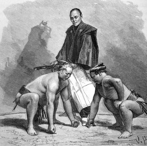Le Nihon shoki, Annales du Japon achevé 720, rapporte déjà un récit d'une lutte entre deux prestigieux lutteurs au cours de la septième année du règne de l'empereur Suinin. Il semblerait que soit là l'origine des tournois qui virent le jour à la cour impériale.