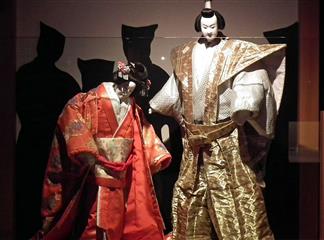 Les costumes sont somptueux, faits de soie et de brocart aux nombreux motifs travaillés. Les masques de bois sculptés, peints et décorés, traduisent le caractère du personnage.