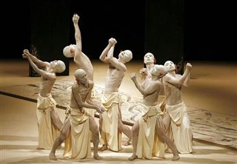 La scène est une estrade carrée et surélevée sans décor, le public se dispose sur trois des quatre côtés de le scène. L'orchestre est au fond le choeur à droite. Une passerelle étoite mène des coulisses à la scène.