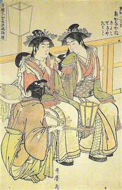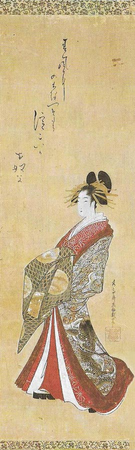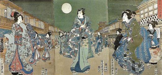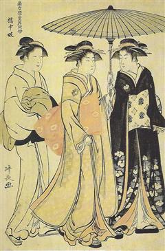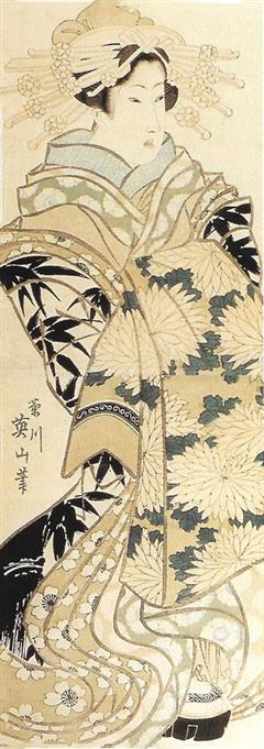 Situé en lisière de la ville, le quartier des plaisirs ou Yoshiwara était établi au milieu des bambous verts le long des berges du fleuve. Les courtisanes, célèbres par leur beauté, leur esprit, leur connaisance de la musique de la poésie, reconnues pour l'élégance de leur comportement, recherchées pour leur conversation, vêtues de somptueux kimonos de brocart, furent elles aussi une source d'inspiration infinie pour les créateurs de ukiyo-e et qui en firent inlassablement leur portrait.