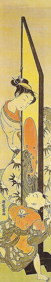 En 1764 apparaît un nouveau jeu qui consiste à pendre tous les mois dans sa demeure, lorsque l'on est un bushi ou une personne aisée, une nouvelle image de calendrier, si possible toujours plus belle toujours plus raffinée. Ainsi né le nishiki-e plus affiné plus coloré. Les couleurs plus nombreuses sont très librement associées entre-elles, par l'utilisation de couleurs sur plusieurs planches ouvrant de nouvelles perspectives en matière de gravure et d'impression.